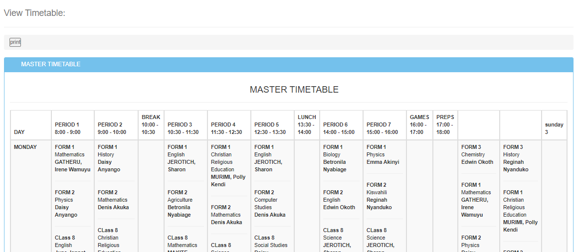 To view the master timetable click “Timetable” then “Master Timetable”