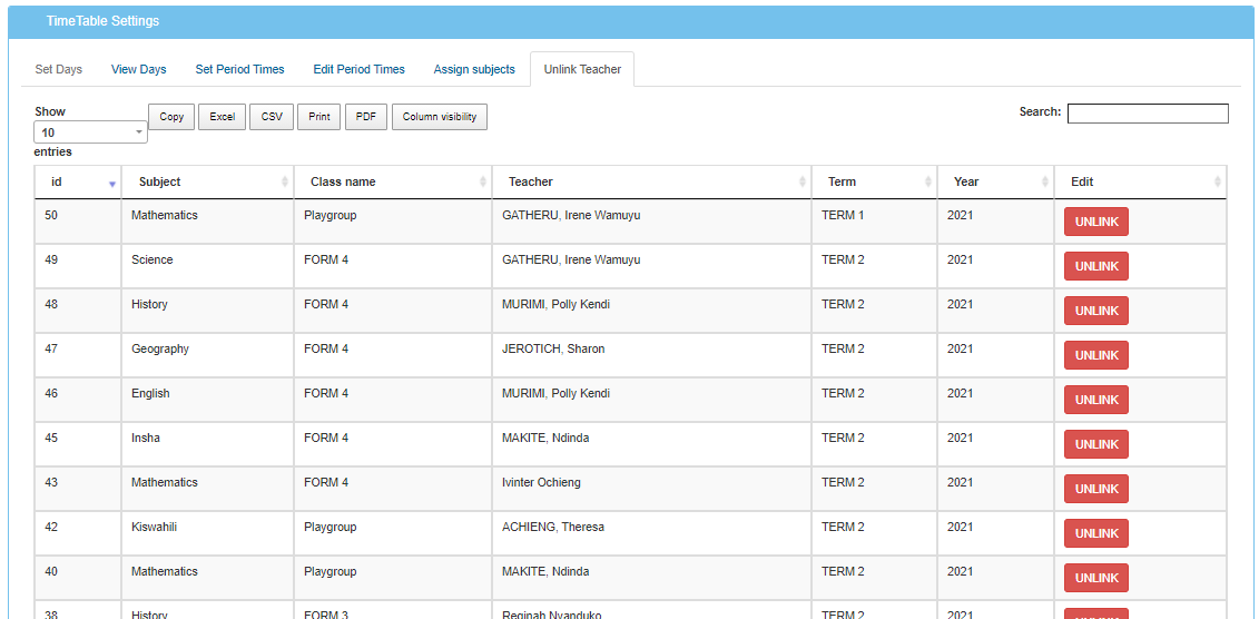 To remove a teacher from the timetable of a particular class click on “Timetable” then “Setting”, then click on the “Unlink teacher” tab to view all the teachers and which class they teach. Click on unlink teacher to unlink them.