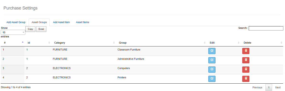 Here you will add asset group and the assets in the group, Add asset items and delete or edit by using the edit button.