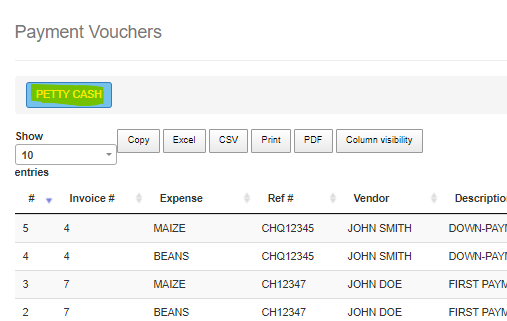 Here we record payments that have been made towards the supplier’s invoices recorded earlier. These payments are the ones paid using petty cash.