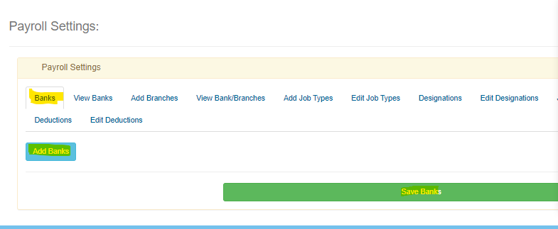 A page will be displayed with multiple tabs click on “Banks” to add a bank then click save bank to save it.