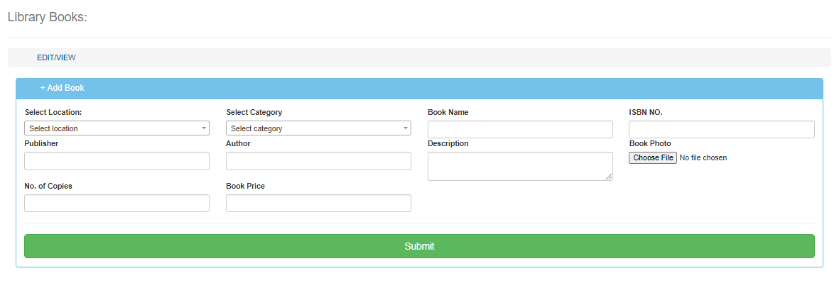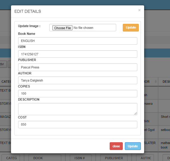 Fill in the details of the book, ie name, author, etc to select a photo click “Choose file” then locate where you have saved the picture and upload it, after you have ensured the details are correct click “Submit”. This will include books such as Mathematics textbooks which are under the textbook category etc.