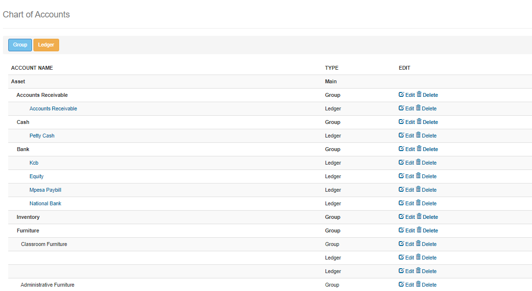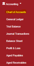 You will be able to view the account Name, Type and edit the name of the group or Ledger to do this click on “Accounting” then “Chart of accounts”
