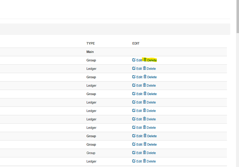 To delete a ledger or group, locate the account and click on “Delete”