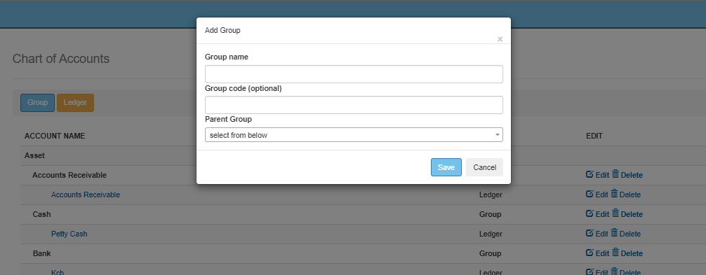 To add either a ledger or a group click on the “Group” button and enter the details,