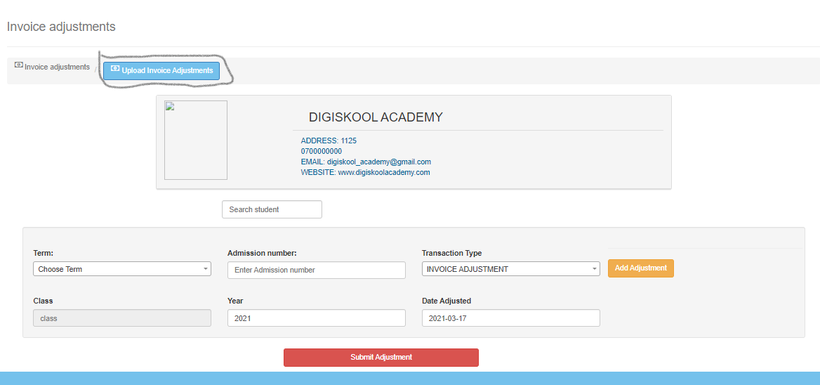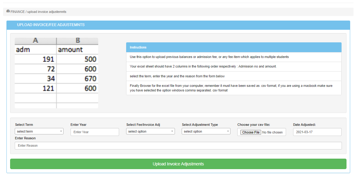 - If the adjustments are negative adjustments then add a negative sign before each amount for each student in the excel file ( i.e Adm001 -230, Adm002 -349, etc)