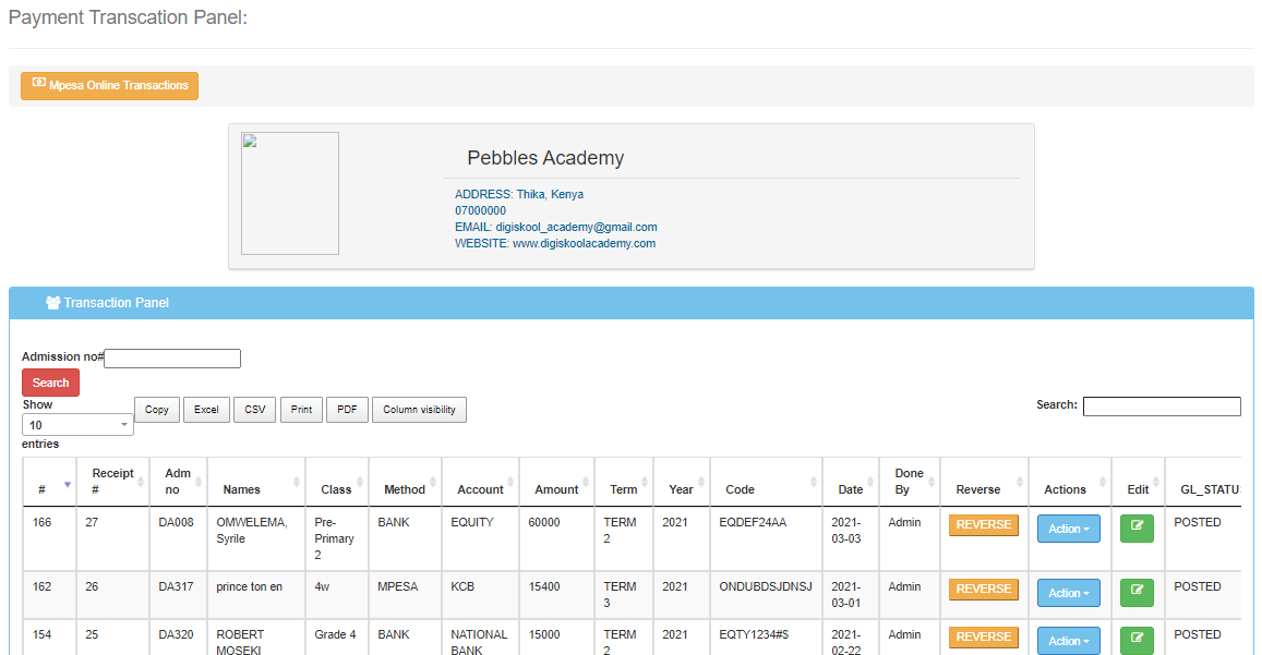 - You can search various payments by entering the admission number for that student and then clicking on search(red button). This will give you all the transactions for that student.