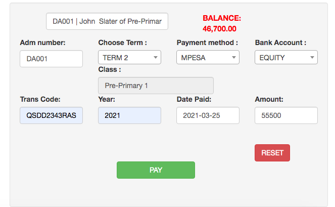 - Search for the student( either by name or admission). The balance of the student should be shown when you find the student.