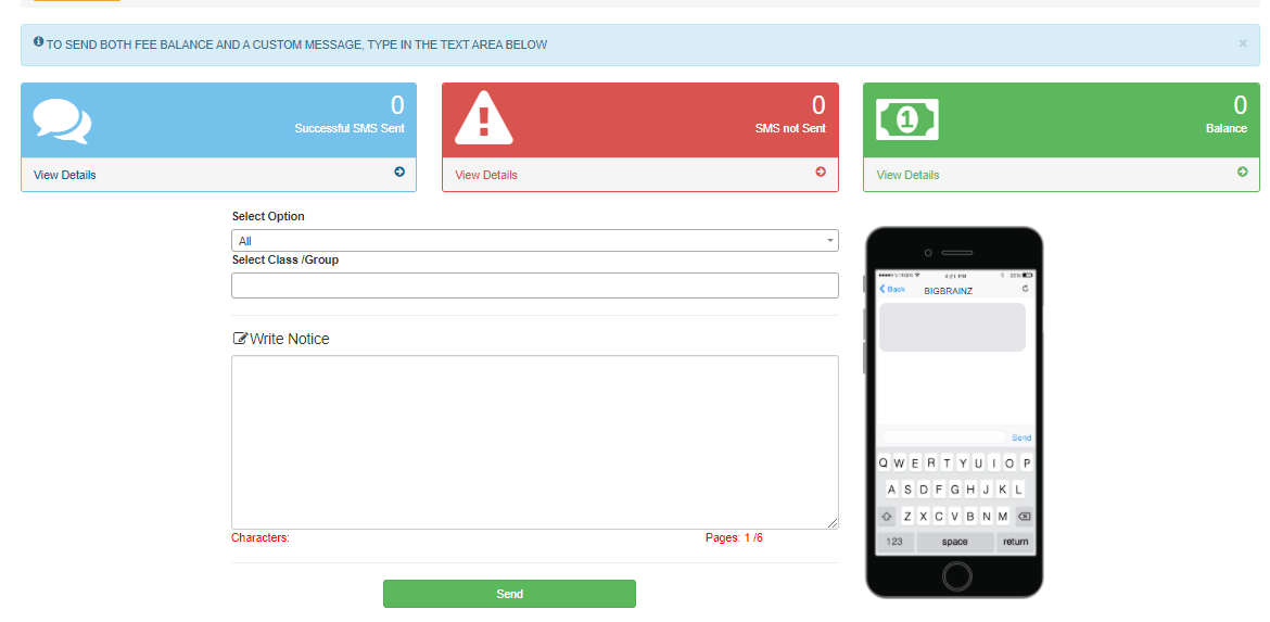 note: The system will automatically embed the fee balances to the SMS and send and will only send to those parents with students having a fee balance.