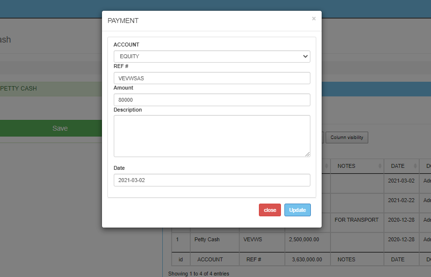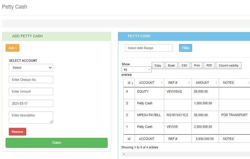 To add the petty cash click on “Add” then fill in the details required. This is by taking money from one of the accounts and using it to top up the petty cash and click save.