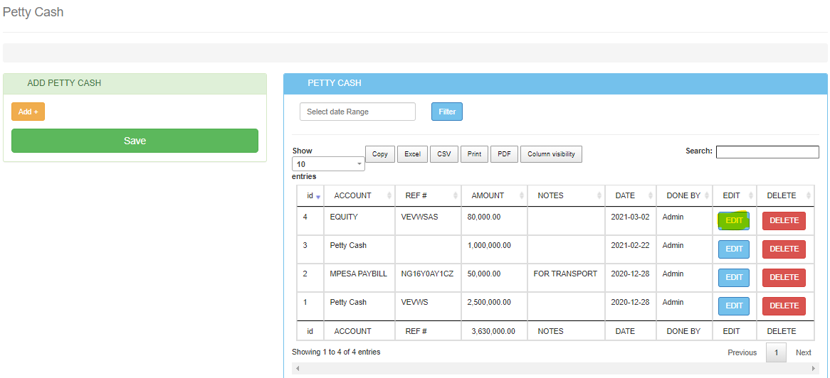 To edit the petty cash, on the right side all the petty cash will be displayed, locate the petty cash you want to edit and click on “Edit”
