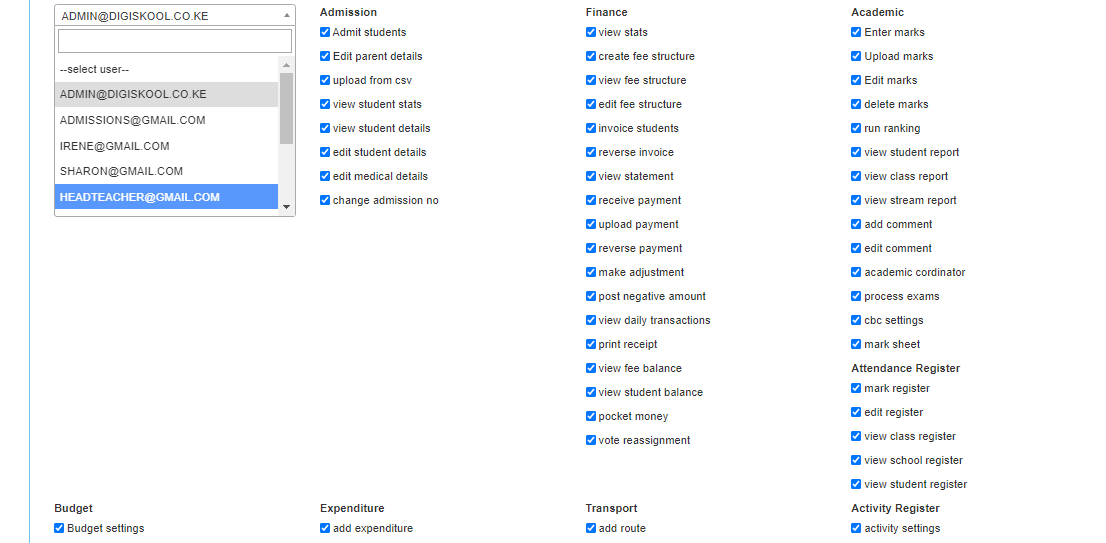 - Mark the checkboxes you want the user to administer