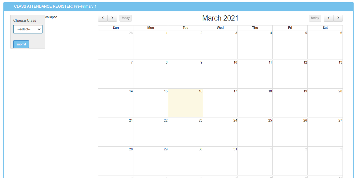 • Choose the class and then click submit. You will be able to see those students who are present or absent in that class for the given week or month etc.
