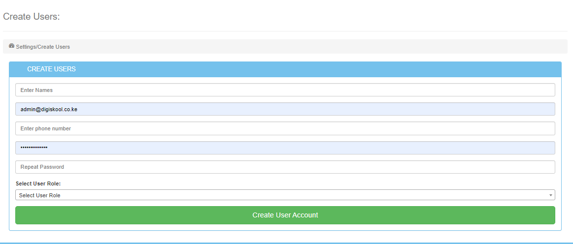 - Add user’s details in the form and click the “Create user account” to save the details.