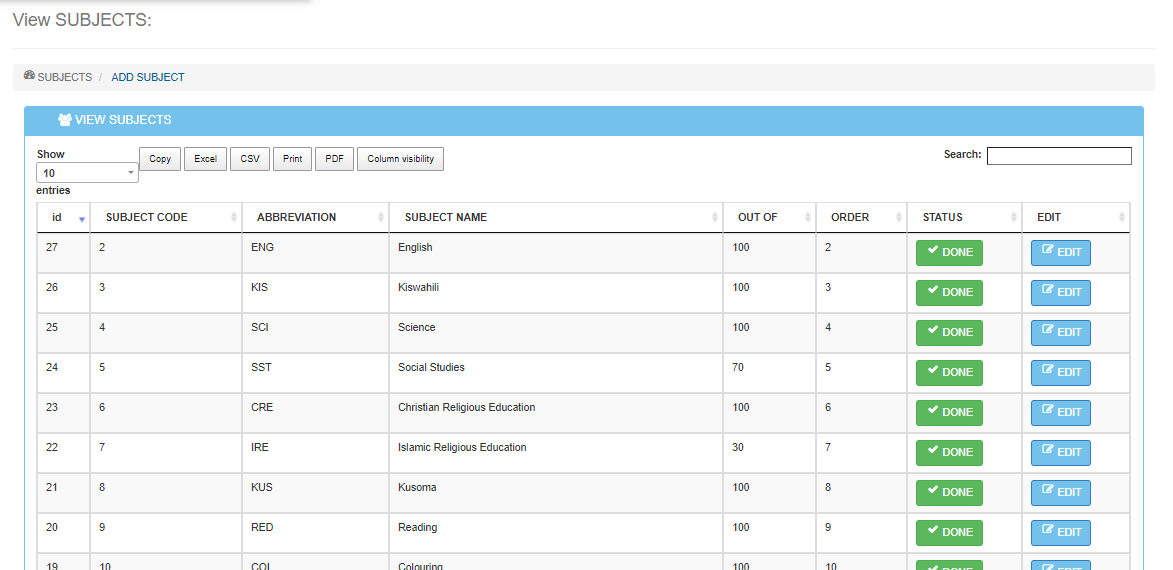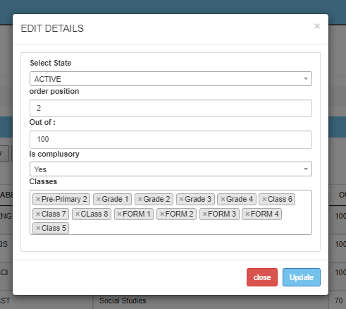 - To edit which classes take the subjects click on “Edit” to change the classes, the edit form will pop up,(You can edit the state to inactive,compulsory,or classes) when finished click on the update to save the details