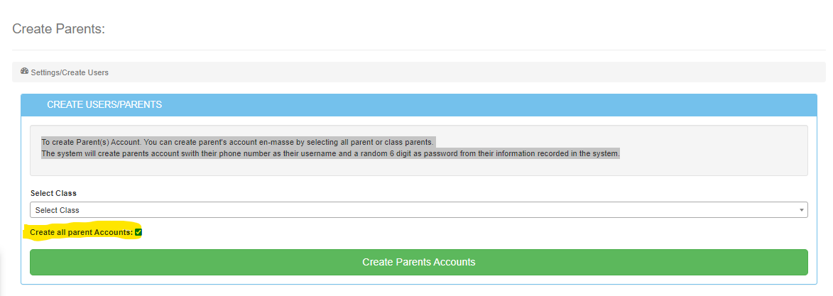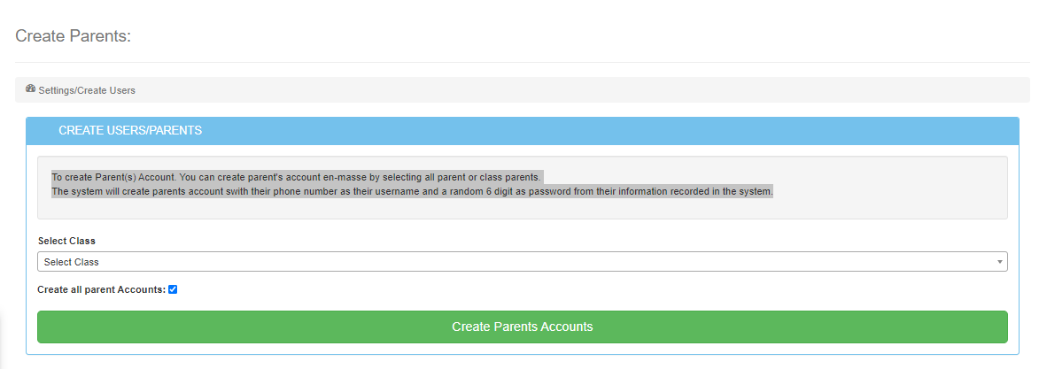 The system will create parents account with their phone number as their username and a random 6 digit password from their information recorded in the system.