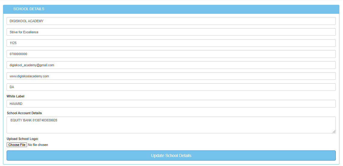 - Enter the details in the new form and click “Update school details” to save the data