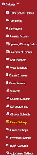 To set which type of exams are takenĀ or done in a given term or the school in general, Click on settings then click on “Exam settings”