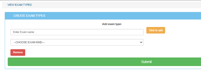 - On the new pop-up form select the type of exam and enter the exam name, to add another exam type click the “to add” button and submit.