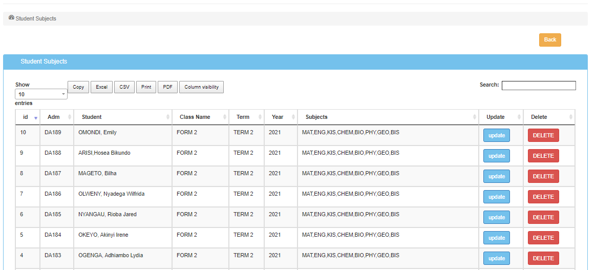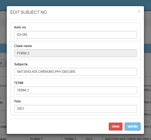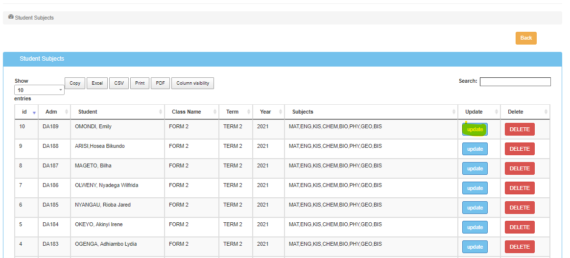 - Search for the student using student name in the search bar then click on “update” to change the student subjects