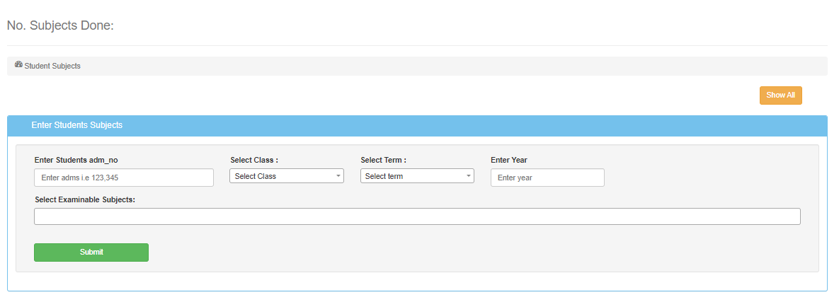- The form will be as shown below, fill in the correct details. Type in the different admission numbers to add multiple students( i.e 1234,234,345). This is useful when adding subject combinations done by the same students. Enter the class, Term, and Year. Choose the subjects and then click on the “Submit” button to save the details.