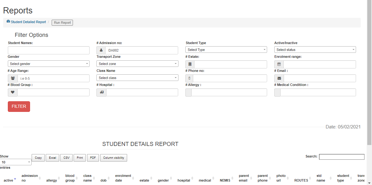 Student detail report allows you to view all the details of a particular student, to do so follow the instructions below.