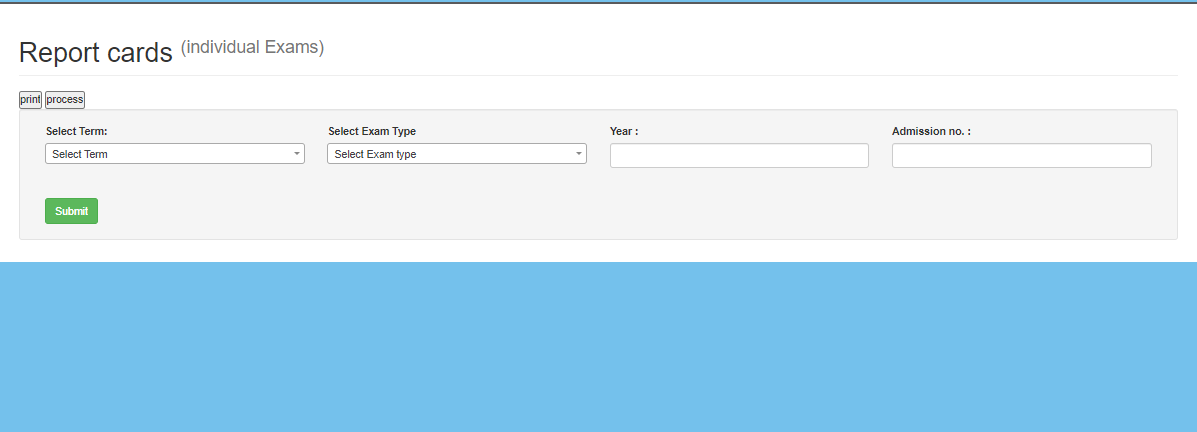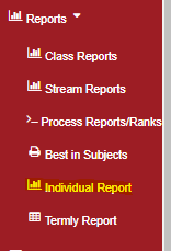 You can also print the class report, stream report, or individual report card from the respective modules.. Click on ‘view’ to view a student’s individual report card.