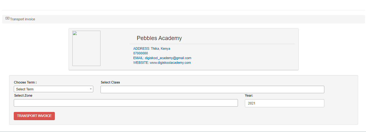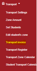 Here we will be able to invoice the students for the various transport zones depending on the amounts assigned to those particular zones, the invoice page will be displayed as shown;